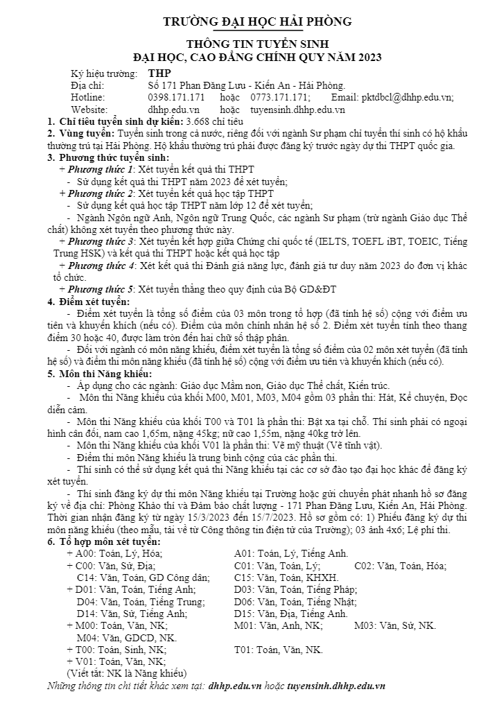 Trường đại học Hải Phòng được thành lập vào năm 1959 và được thành lập dựa trên tên cũ là Phân hiệu Trường đại học Tại chức Hải Phòng. Trường đạo tạo đa ngành, đa lĩnh vực bậc đại học và sau đại học, thông báo nội dung tuyển sinh đại học chính quy như sau: