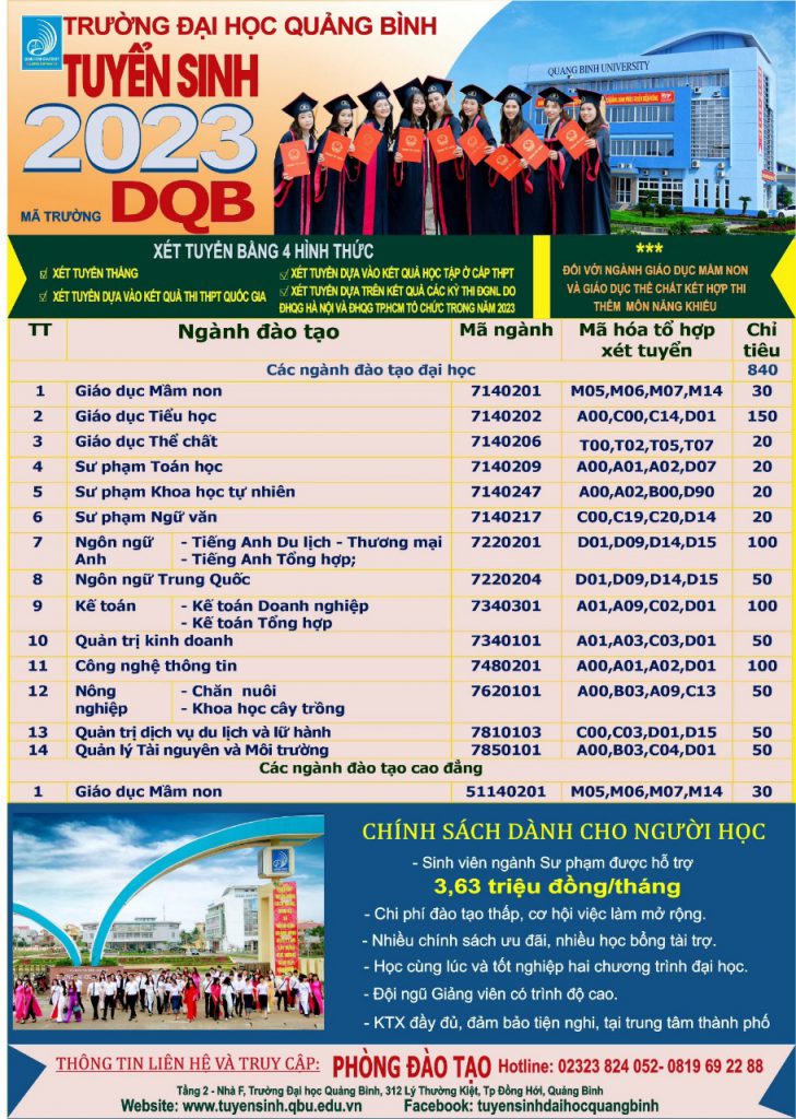 Trường Đại học Quảng Bình là trường đại học công lập được thành lập trên cơ sở Trường Cao đẳng sư phạm Quảng Bình thành lập năm 1959 thông báo tuyển sinh vào Đại học, Cao đẳng hệ chính quy dựa trên kết quả của kỳ thi THPT Quốc gia với chỉ tiêu và điểm nhận hồ sơ xét tuyển cụ thể như sau: